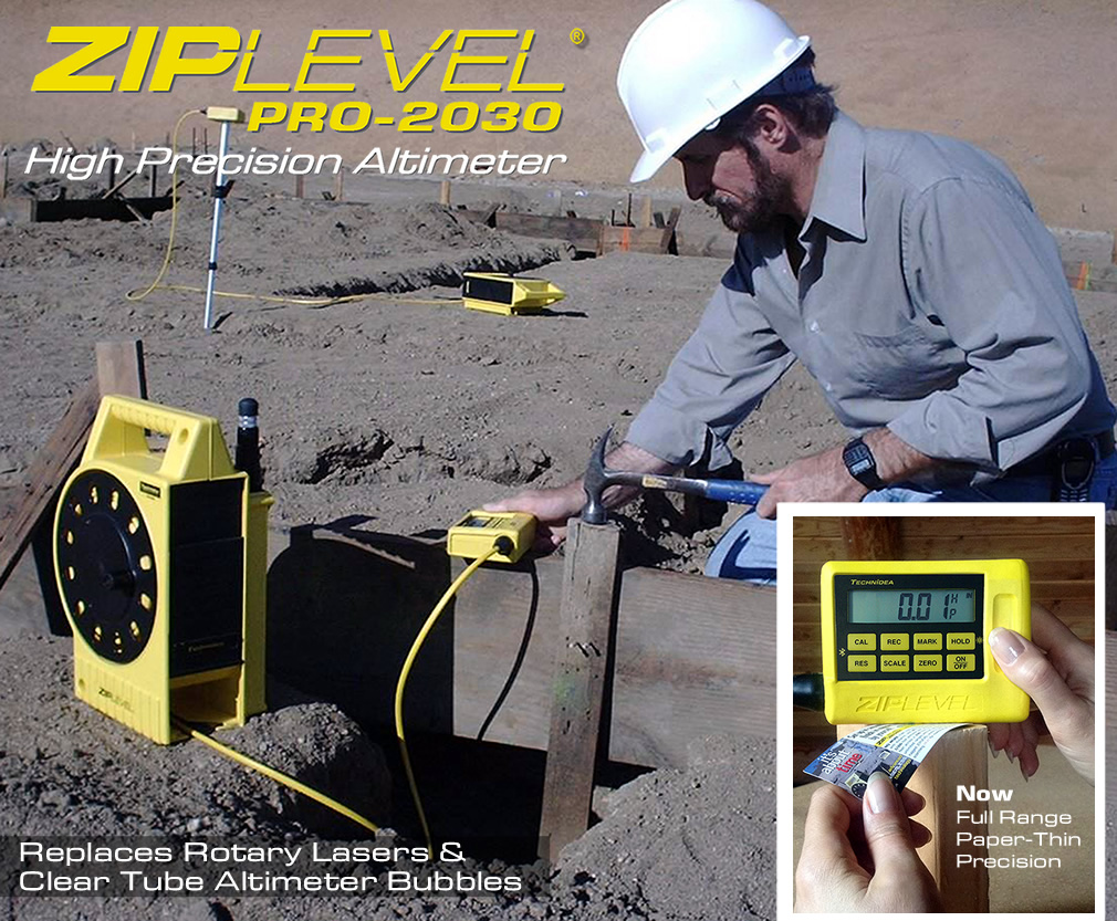 Technidea Corporation, proudly presents its new US$999 ZIPLEVEL® PRO-2030 as the World's fastest, easiest, most powerful level with paper-thin precise unlimited ranges. No more construction laser rods, tripods, line-of-sight, distance error, tabulation, math or factory calibration. No more countless hours searching and bleeding bubbles from historic clear tube altimeters as ZIPLEVEL remains the World's only pressurized, bubble-free hydrostatic altimeter.